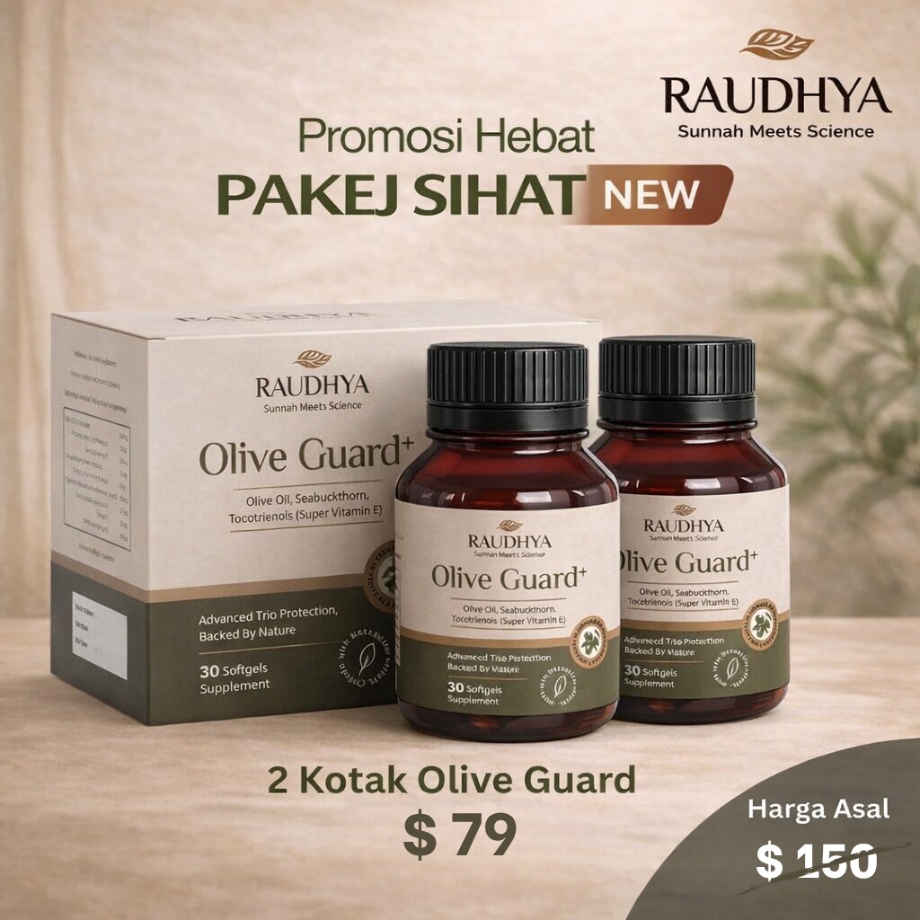 Raudhya OliveGuard+ Diperkaya Bahan Aktif Polyphenols, Tocotrienols (Super Vitamin E) & Omega Aktif Menyokong Kawalan Gula, Kolesterol & Tekanan Darah